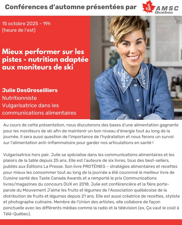 Le 15 octobre à 19 h : Mieux performer sur les pistes – nutrition adaptée aux moniteurs de ski avec JULIE DESGROSEILLIERS, nutritionniste et conférencière. Ne manquez pas cette occasion en or d’apprendre les trucs d’une pro !